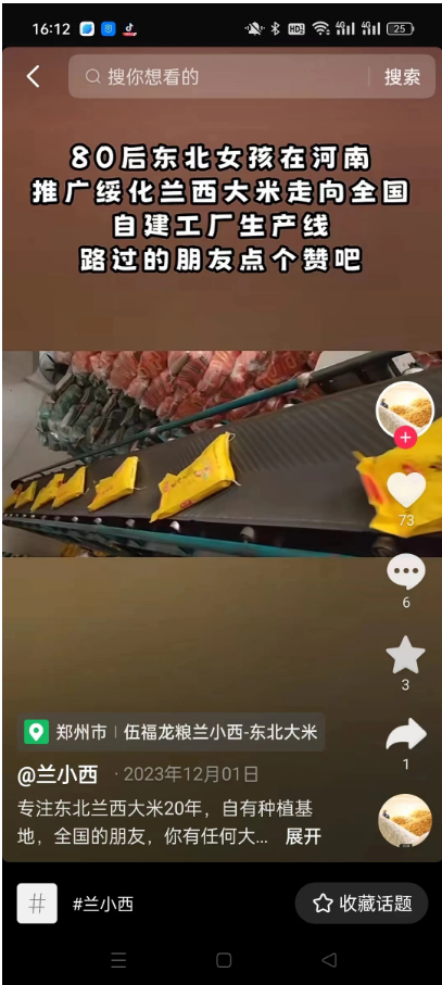 例如:“寒地黑土,让兰西大米口感香糯如油”、“80后东北女孩在河南,推广绥化兰西大米走向全国,自建工厂生产线,路过的朋友点个赞吧”,让视频画面更具有爆款潜质也起到了引流拓客的作用。