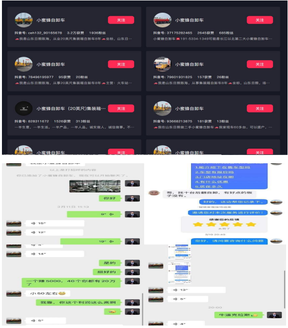 刚开始只有注册了 8 个账号,一直发了一星期,3 月 19 日一个重庆的客户 刷到他视频,说要定 10 台自卸车,到 25 日成交了 40 台,利润接近小 50 万。