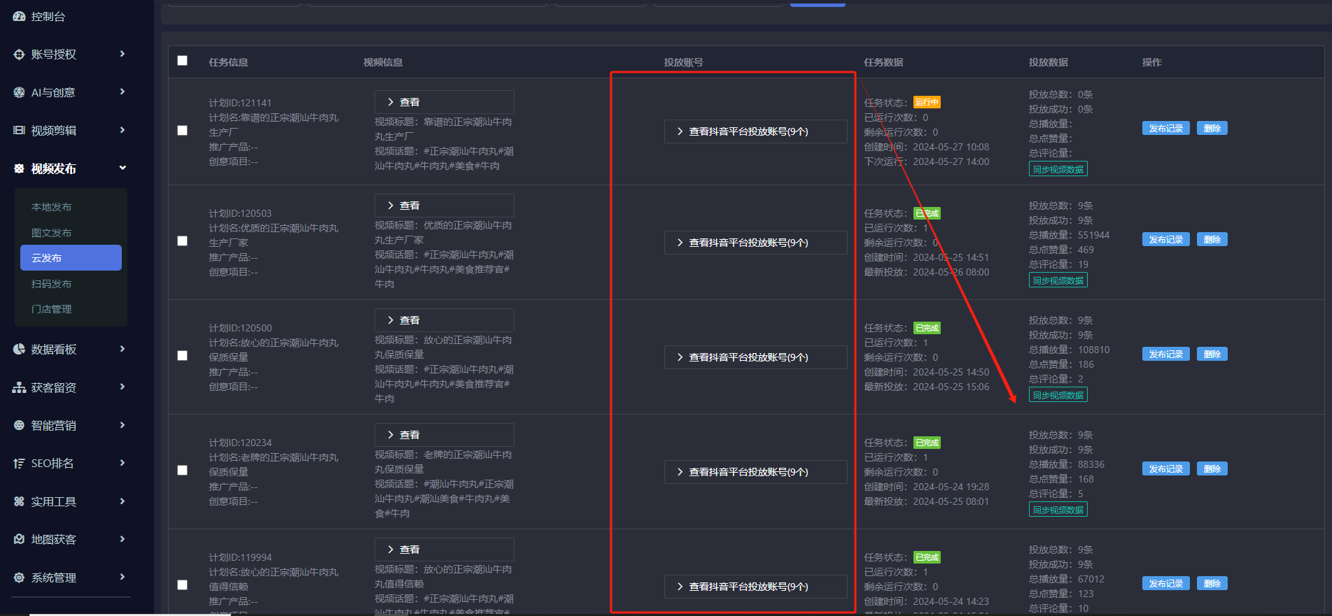 客户绑定30多个账号,精细化的运作,每天安排一个员工来收集素材、用系统可视化批量剪辑、多账号绑定持续定时发布定向触达本地流量,精准挂载poi团购,批量挂载曝光实现无限辐射裂变,迅速精准吸附同城流变现。